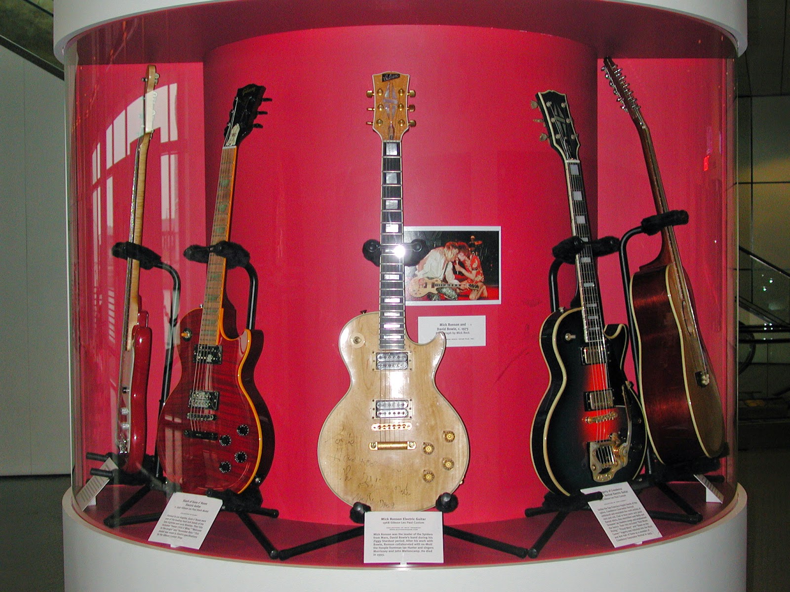 I called a man named Howard Kramer that was the head of things like that at the Hall of Fame. I got his number from my friend and soon to be band mate Dennis Dunaway who had a bass there from his Alice Cooper days. I got Howards secretary and left a message with my number saying I had Mick Ronson’s guitar from his days with David Bowie and wanted to know if they were interested in displaying it there. She said she would pass on the message to him. I don’t think the phone hit the cradle before it rang. It was Howard. He wanted the guitar in the hall … really badly!