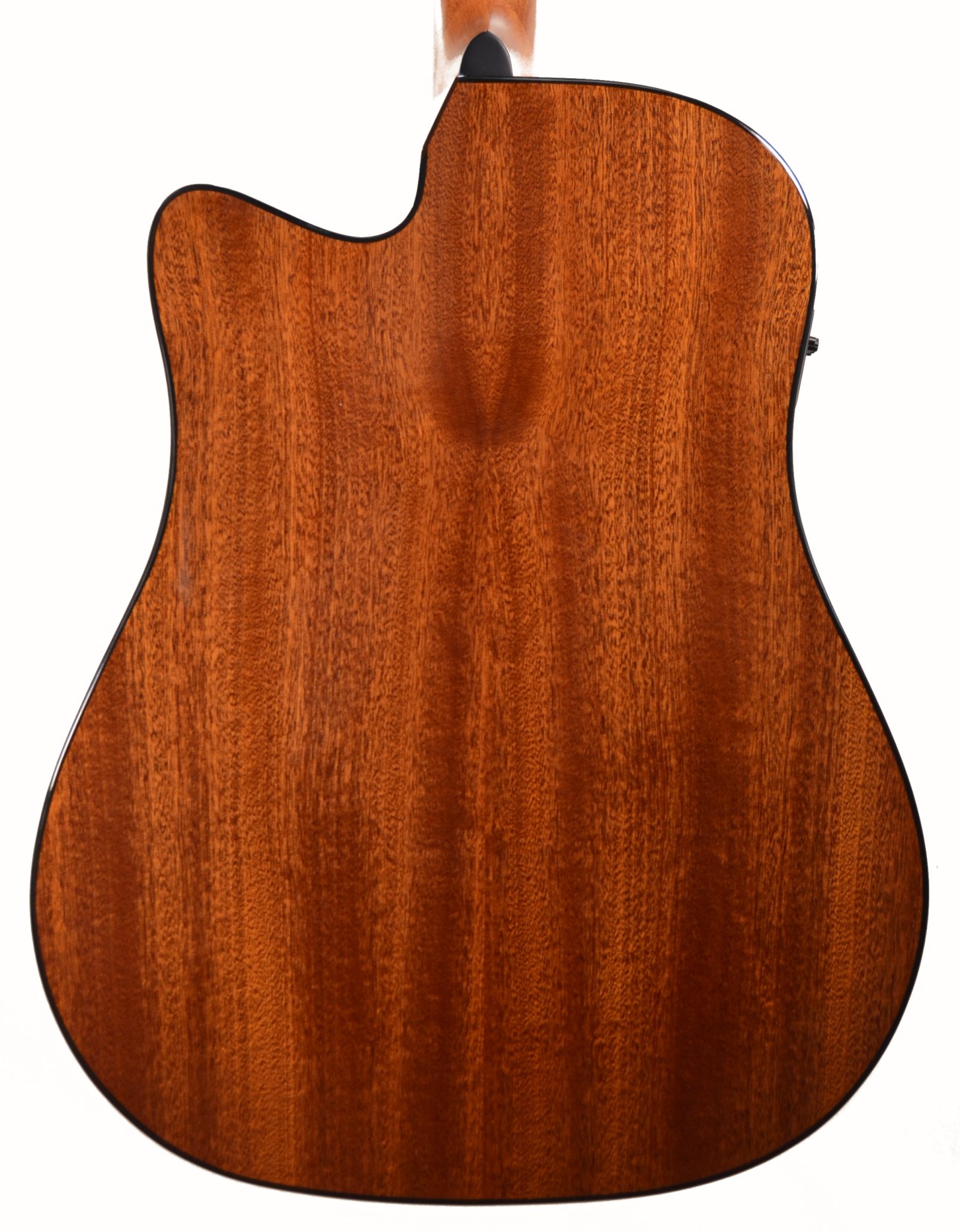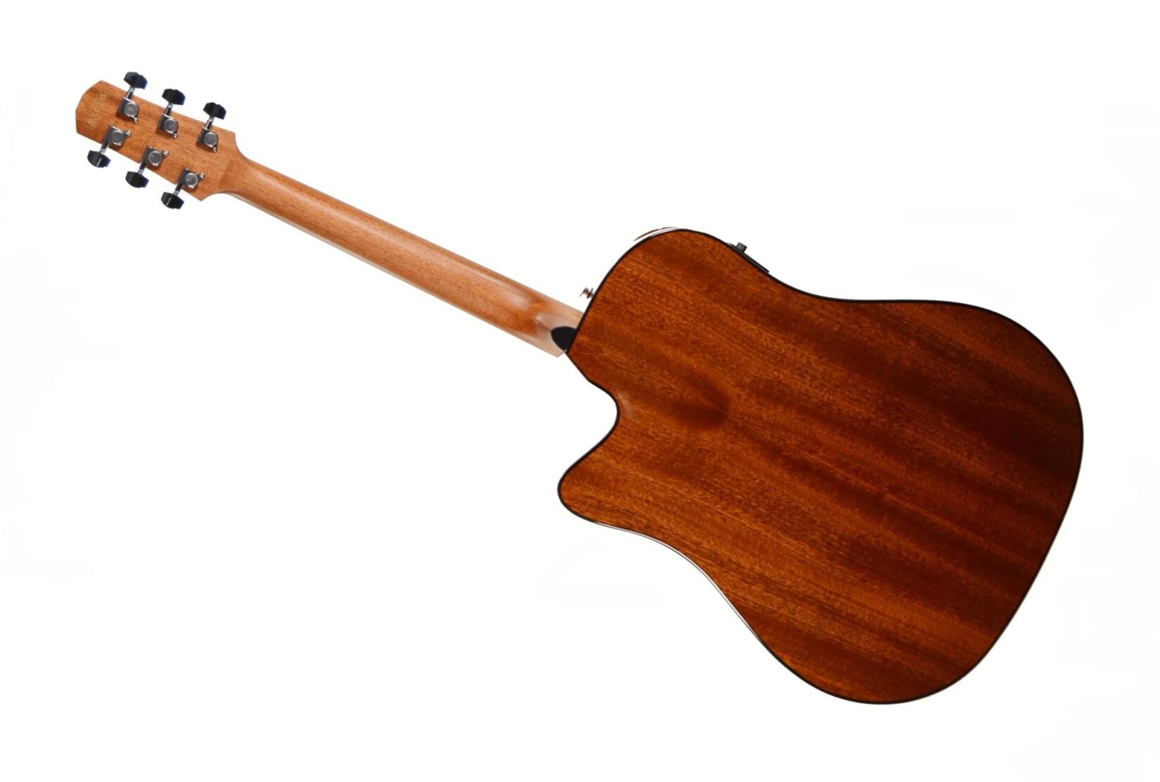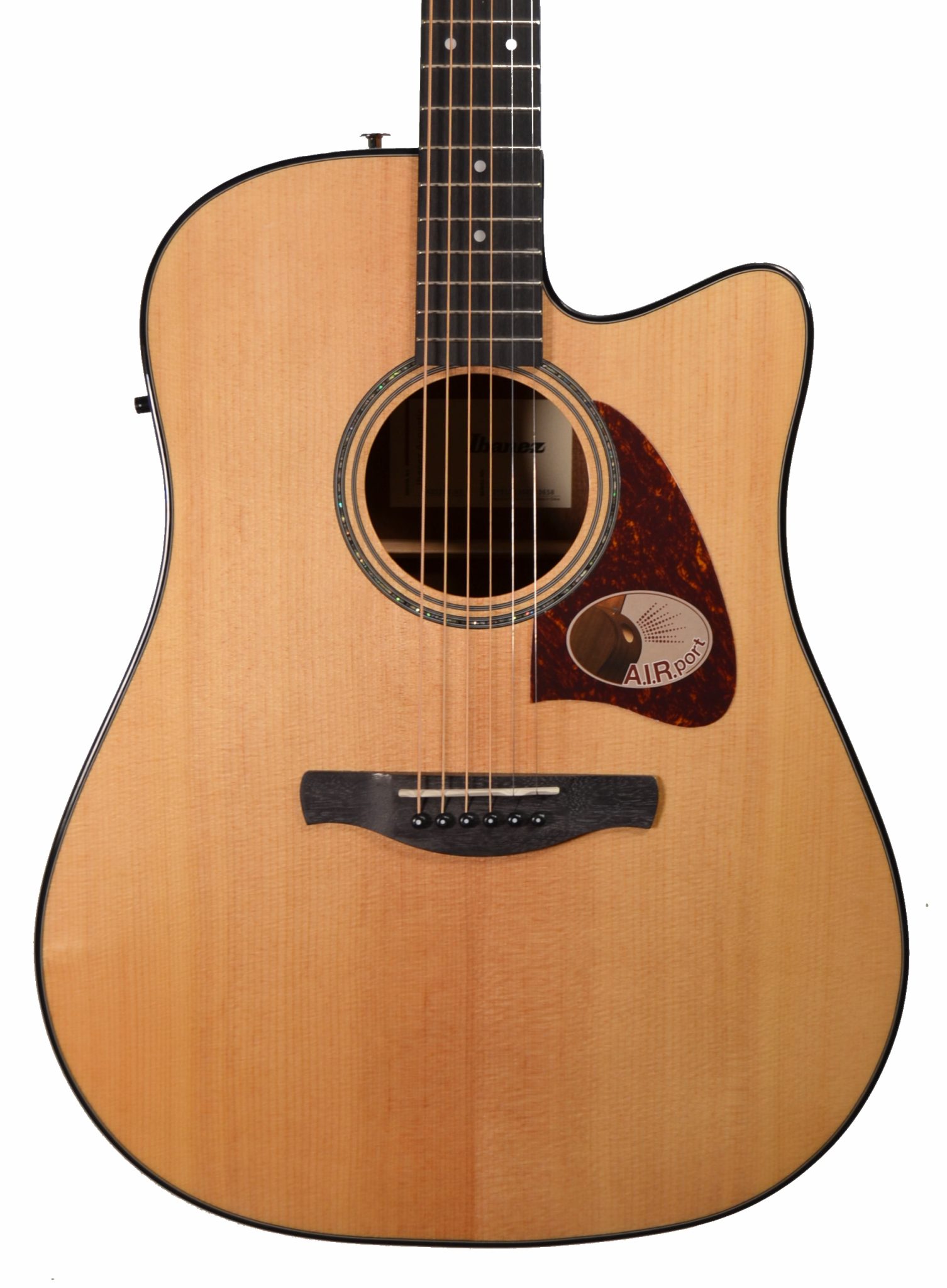 The AAD51CE features a grand dreadnought body shape with an Advanced Access cutaway constructed of a solid Sitka spruce top with X-M bracing and rounded body edge black binding on laminated sapele sides and back with a high gloss finish. The soundhole is round with an abalone rosette and a red tortoise pickguard. Additionally an A.I.R. port in the top side of the guitar directs sound toward the player; a removable cover is included. It has a low oval grip okoume neck with a 20-fret purpleheart fingerboard and white dot position markers. The tapered headstock sports the Ibanez logo in an italic block font.