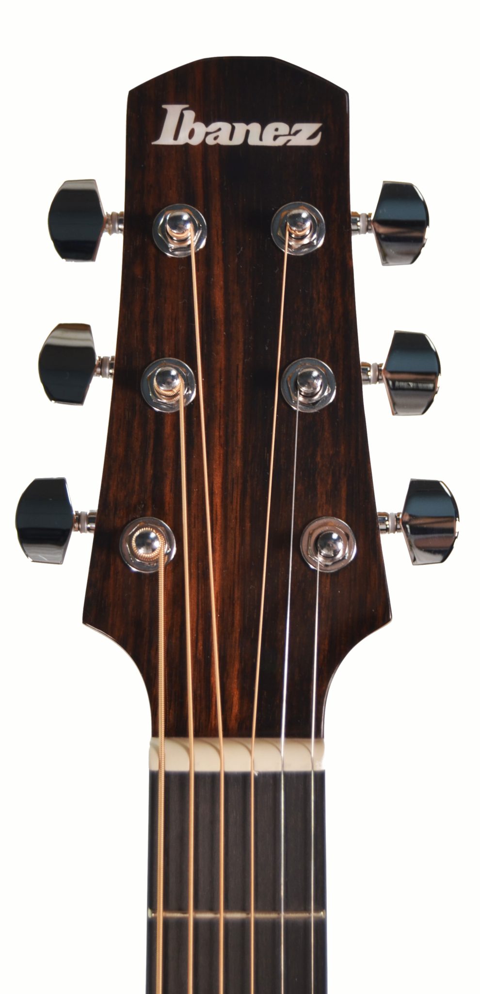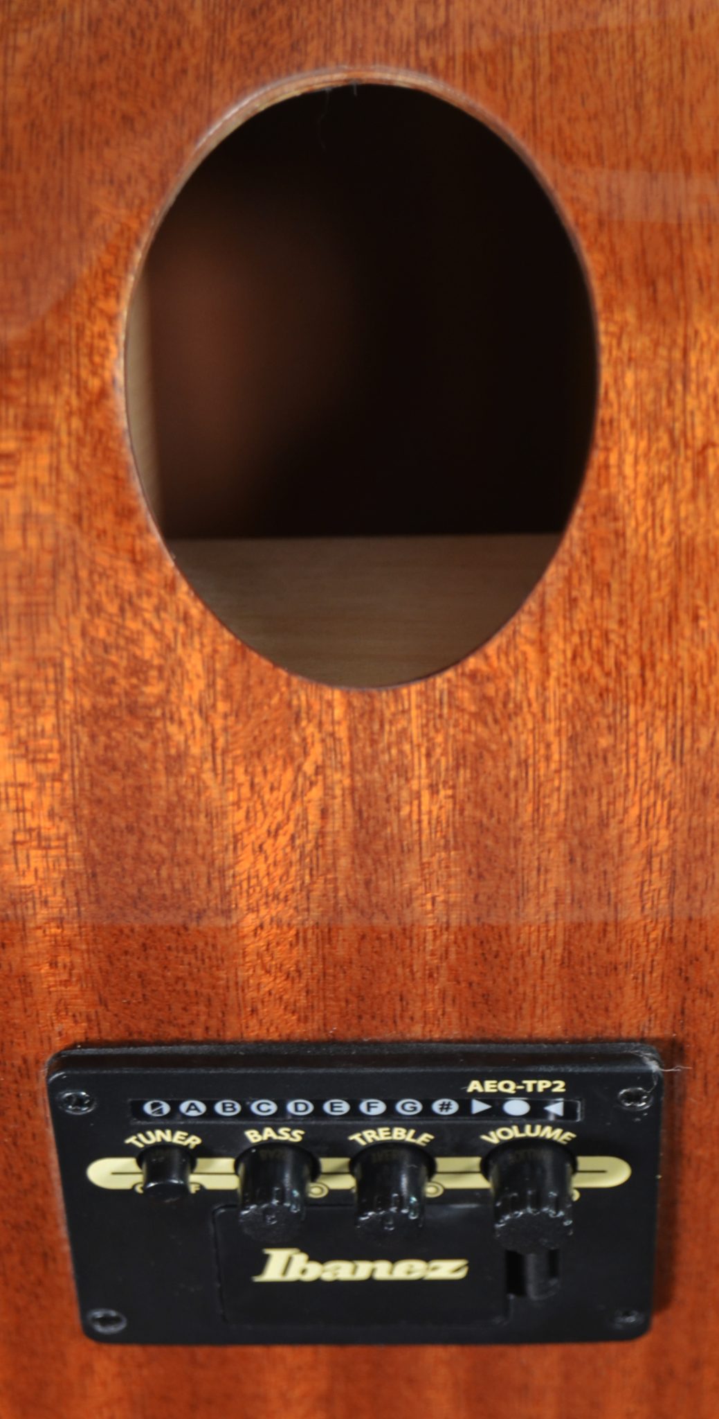 Components include a compensated plastic saddle in a purpleheart bridge with black Ibanez Advantage bridge pins, a plastic nut, and chrome Ibanez die-cast tuning machines. Electronics consist of a T-Bar undersaddle pickup connected to an AEQ-TP2 preamp w/ on-board tuner and two-band EQ which feeds balanced XLR and ¼” output jacks.