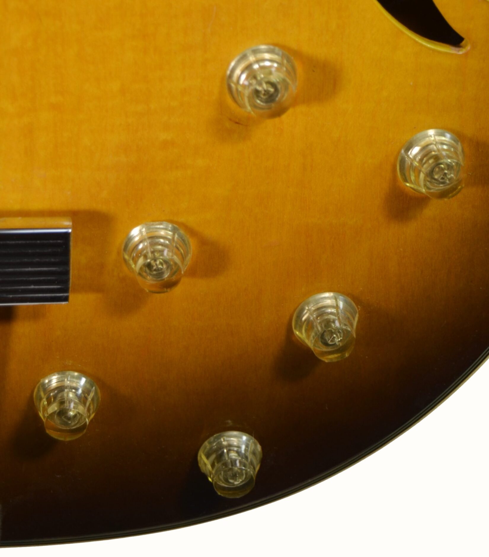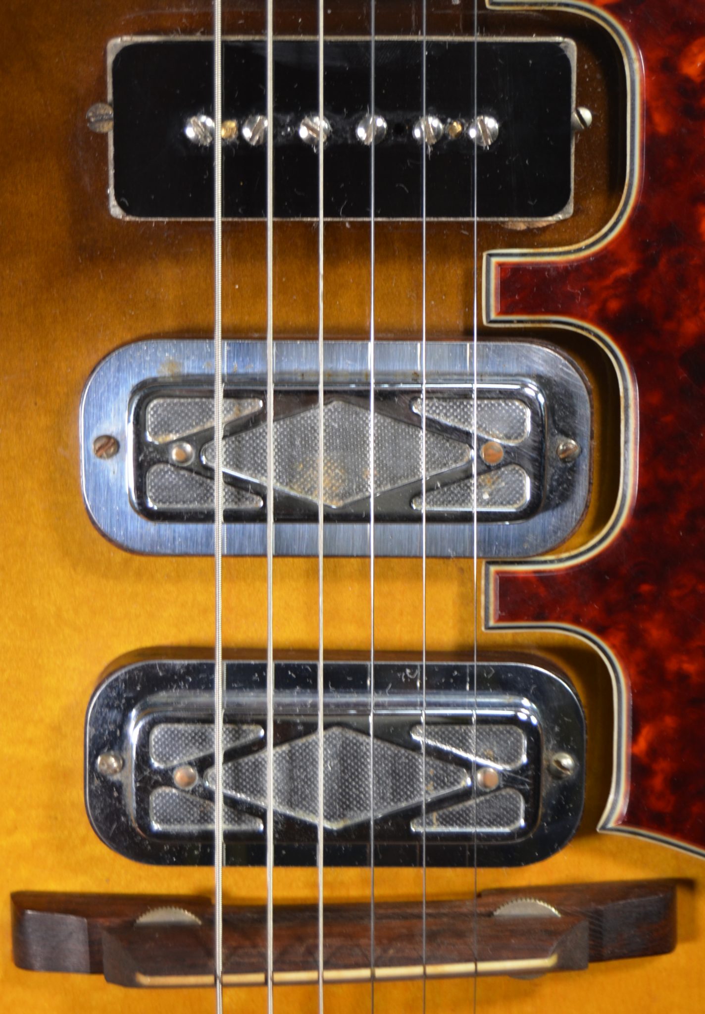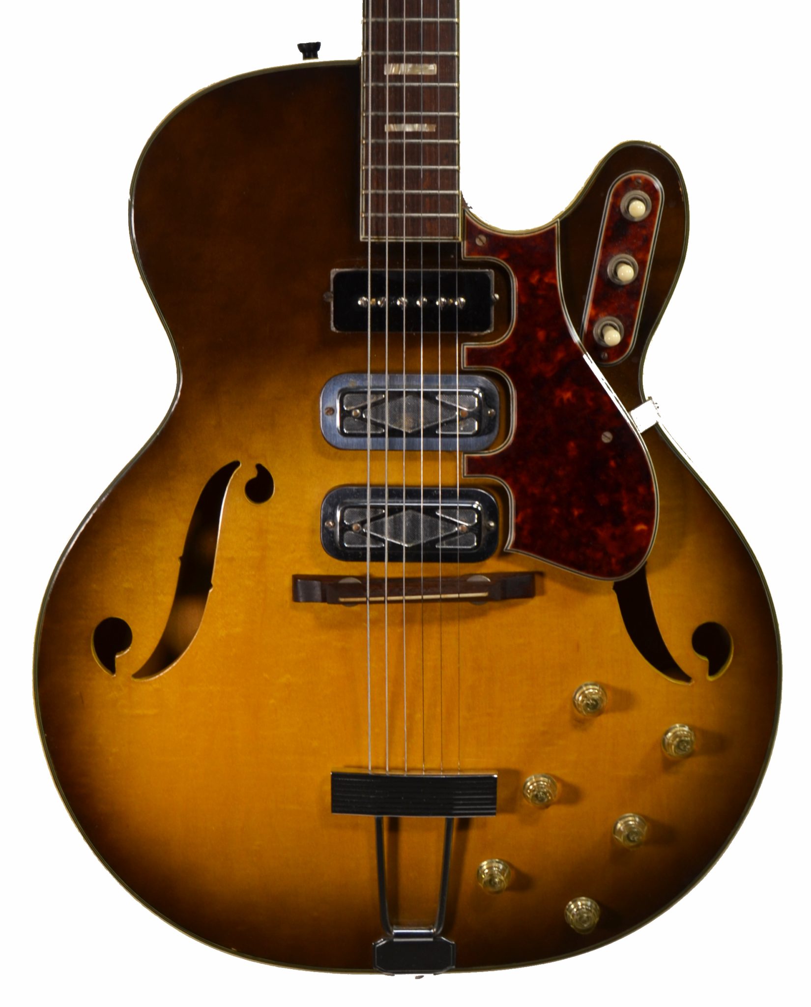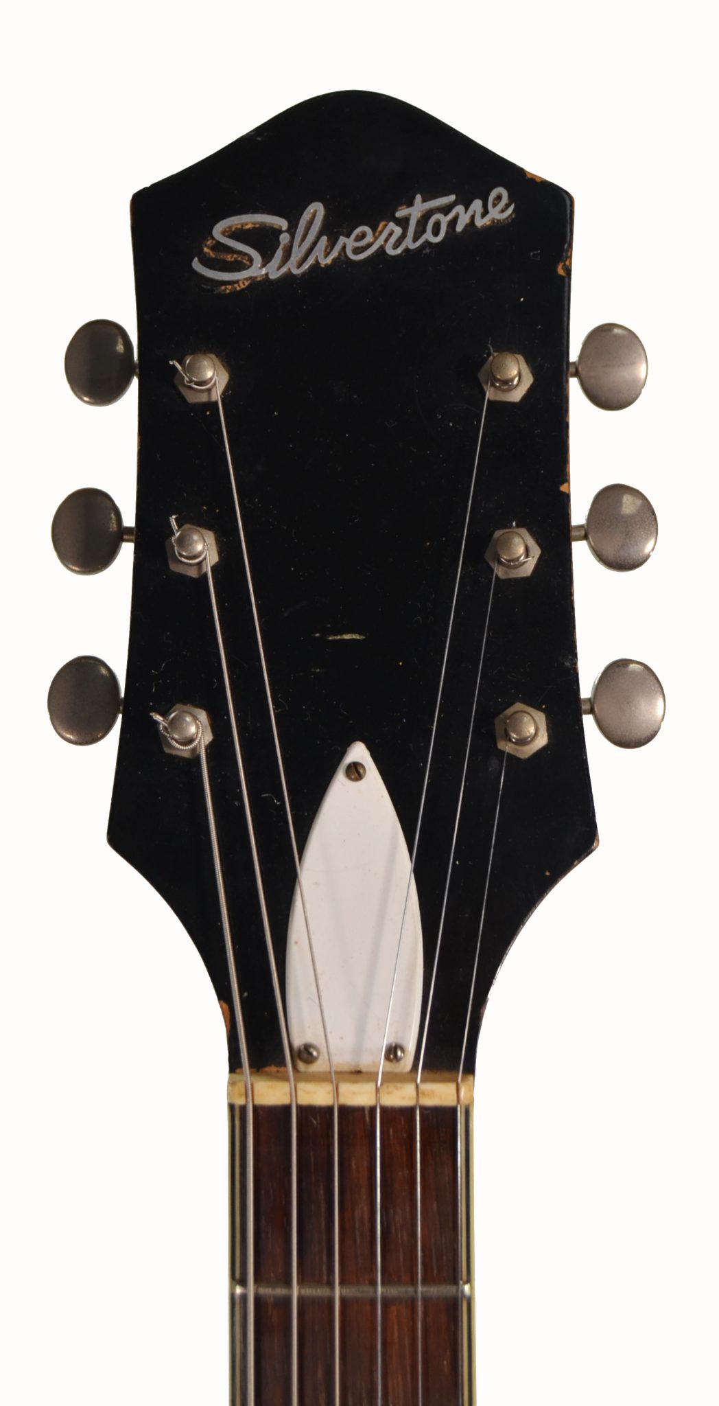 This top-of-the-line Silvertone was produced by Harmony and is similar to the Harmony H75. This guitar is one of the most sought-after Silvertones for collectors. Later models were made with a Bigsby tremolo system as the Silvertone 1454. This one comes with the original chipboard case. The only non original thing is someone put a P90 in the neck position but the original pickup is working and included! Normal wear and tear, the worst being by the jack but its been repaired and solid. Frets are in excellent shape. Take a look at the pics and consider them part of the description!